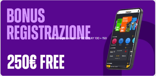Netwin offre anche un’alternativa dedicata agli appassionati di scommesse sportive. Il pacchetto sport mantiene il bonus senza deposito da 250€ (con le stesse modalità descritte sopra) e aggiunge un’offerta specifica sulla prima ricarica.